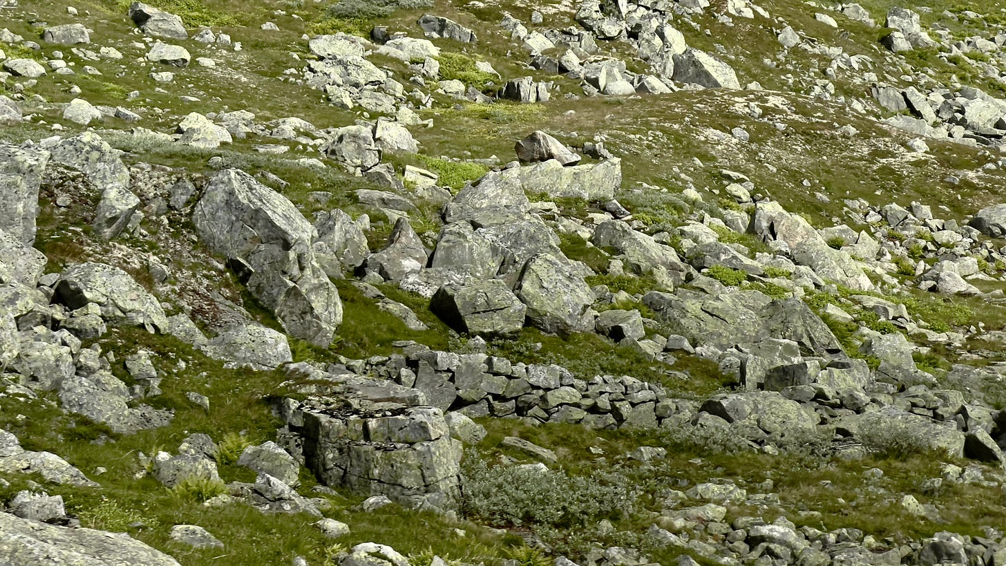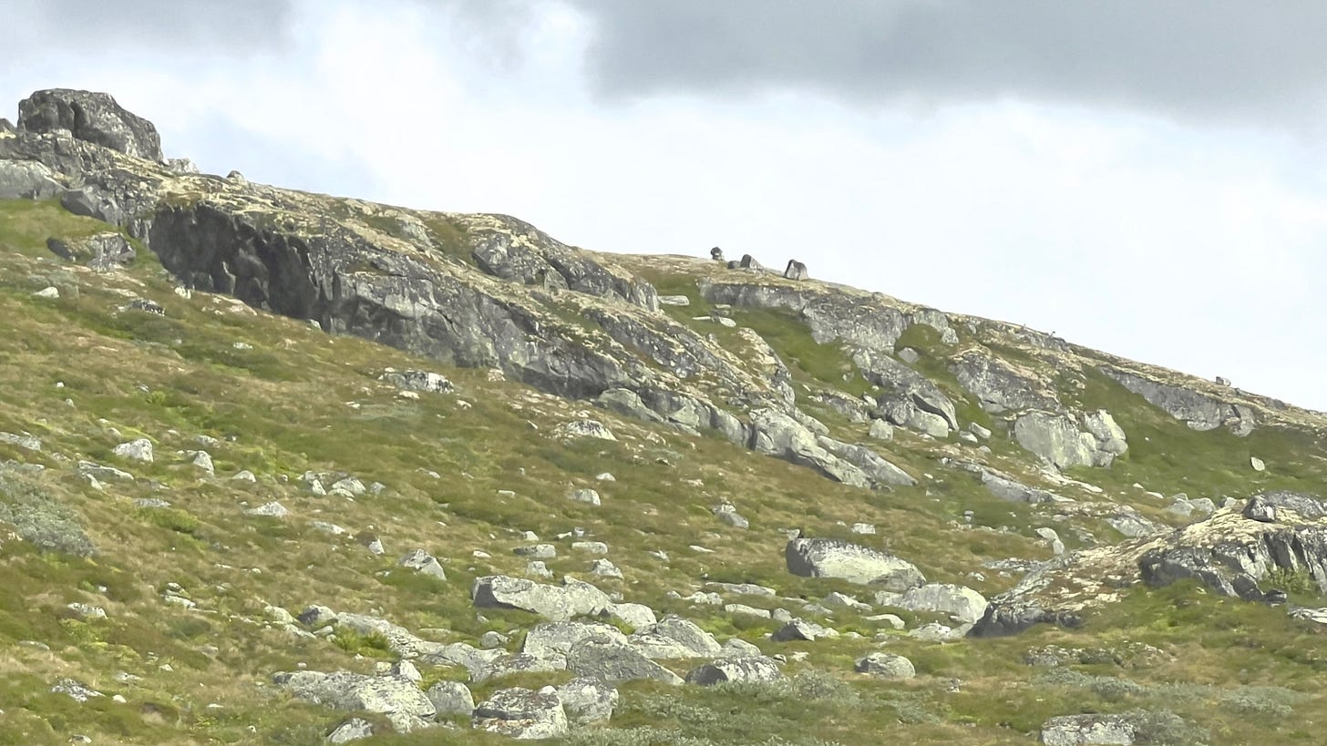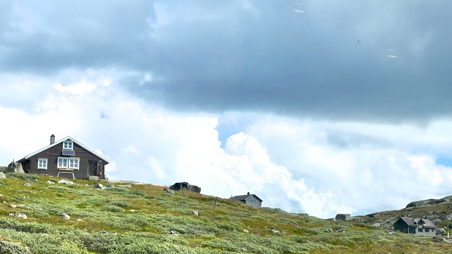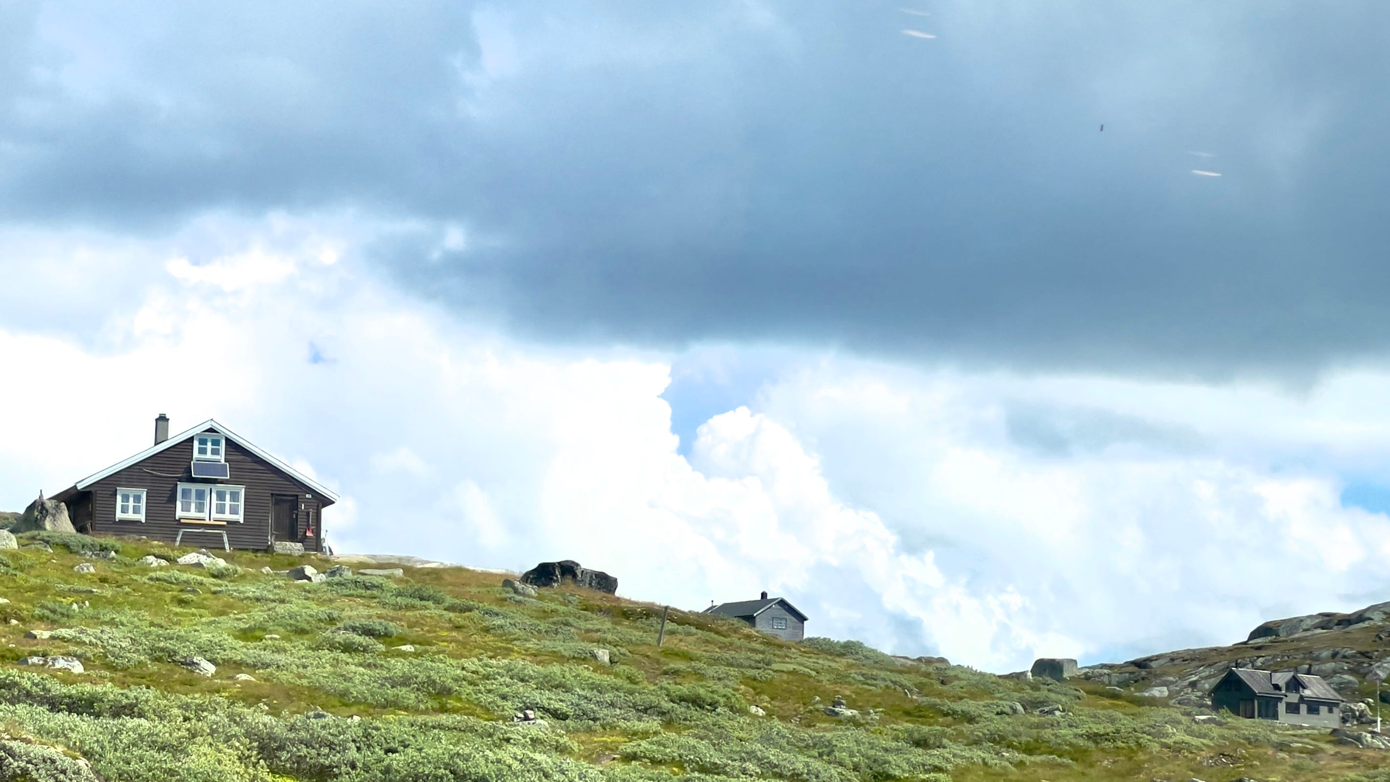 The fells of the plateau—the Hardangervidda region—alpine, flora a few inches high, bedrock a few inches below, glaciers just out of sight, glacial milk in streams, reindeer herds I hear, people with backpacks I see—this is where land and sky worship each other and hikers simply witness.